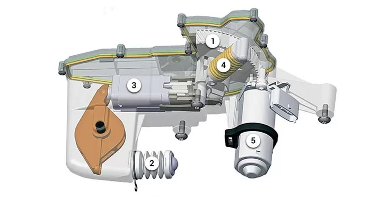 1 — приводная шестерня; 2 — шток вилки сцепления; 3 — компенсатор износа; 4 — компенсационная пружина; 5 — электромоторы.