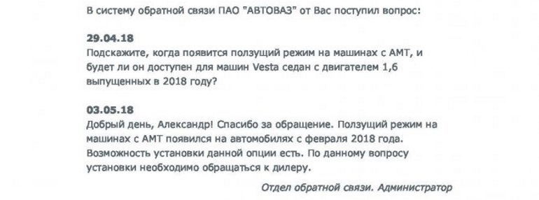 11.05.18: «Режим ползучести» и другие возможности обновленной автоматизированной механической трансмиссии (АМТ 2.0) заинтересовали большое количество владельцев Lada Vesta. Многие из них хотели бы обновить подобным образом свои автомобили, выпущенные до февраля 2018 года. С подобным вопросом обратился на АВТОВАЗ через форму обратной связи один из пользователей сайта. Ответ: